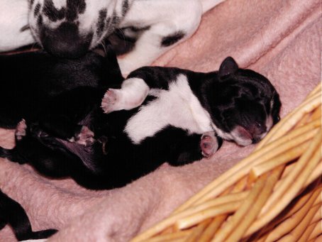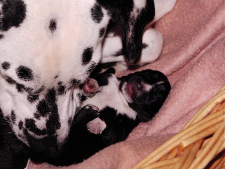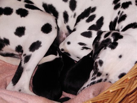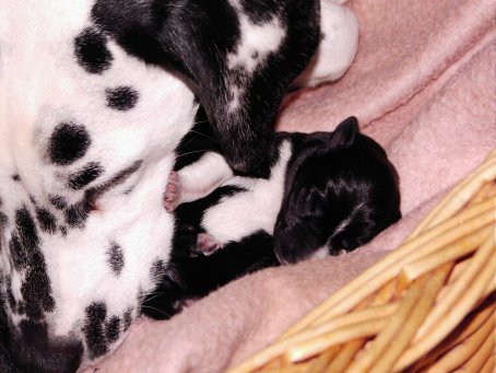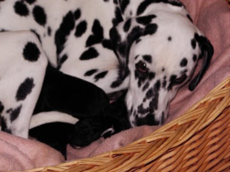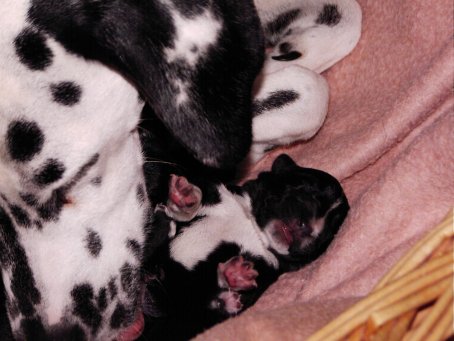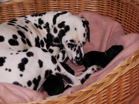 Hier seht ihr die glückliche Mama "Angie" mit ihren 3 kleinen Babys. Morgens dachten wir Angie ist krank. sie war schon lange "scheinträchtig". Tomi fuhr mit ihr zum Arzt und....... was für eine Überraschung! Um 13.30 Uhr wurden Max und Angie dann glückliche Eltern. Puh, erst mal daran gewöhnen!!! | ![]() |